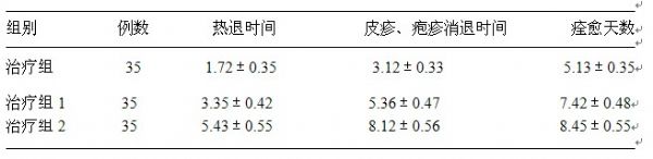 ??? 表1顯示:?治療組和對照組1、對照組2在熱退時間、皮疹及皰疹消退時間、痊愈天數比較:q*?為4.53?(?P<0.05)、4.85(?P<0.05?),q為4.04(?P<0.05?)、4.25(?P<0.05?),q為3.59(?P<0.05?)、3.76?(?P<0.05),均有顯著性差異,對照組和對照組在發熱、皮疹及口腔黏膜皰疹消退時間及痊愈天數比較:q*為3.96(?P<0.05),q為3.78(?P<0.05),q為3.48(?P<0.05)。??