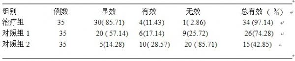 ??? 從表2可以看出:治療組與對照組1?、對照組2總有效率比較,X2分別為7.47(?P<0.01)、24.55(P<0.01);總有效率有非常顯著性差異,對照組1和對照組2總有效率比較X2為7.12(?P<0.01),總有效率也有顯著性差異。??